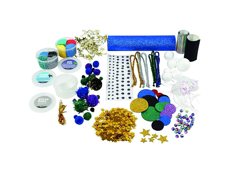 Samenstelling Foam Clay, Silk Clay, Sticky Base, glitterpapier, iriserend papier, glitter pompons, diverse pailletten, zelfklevende wiebelogen, acryl kralen, goudkoord, EVA foam figuren met glitter, piepschuim balletjes, metallic chenille draad, iriserende cellofaan en metaaldraad met sterren.