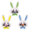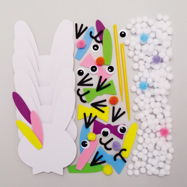 Kleef de witte pomponnetjes op de gestanste paashaas. Werk af met wiebeloogjes en foam stukjes.
