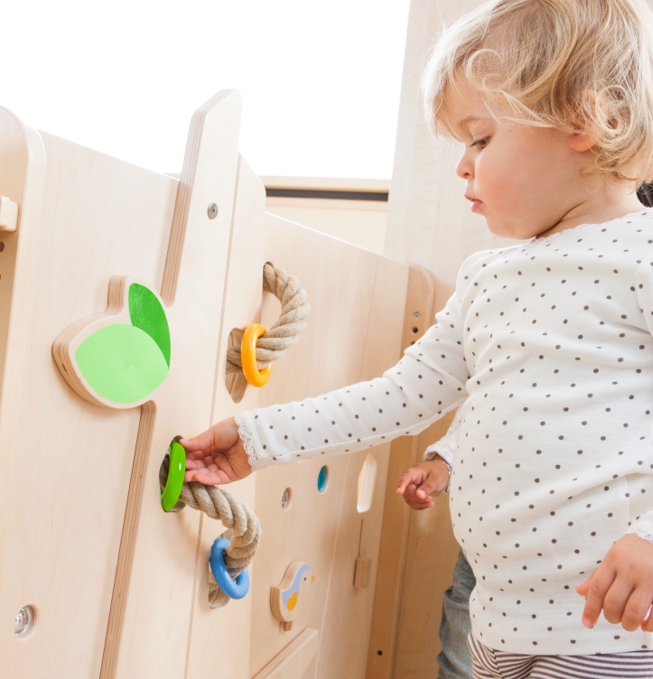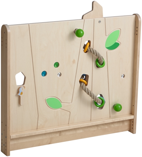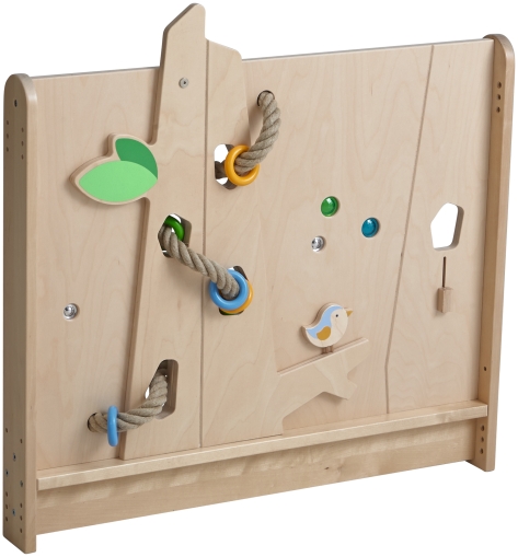 Afmetingen met kleurrijke prisma's. Met het dikke touw met verplaatsbare ringen kan langs beide kanten worden gespeeld. Om de ringen door de gaten te schuiven, is behendigheid en fijngevoeligheid vereist.
