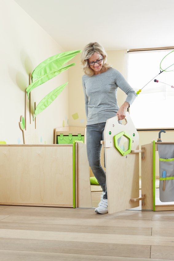 De deur heeft een acrylvenster en kleurrijke prisma's. Kinderen kunnen de deur niet openen, hij moet door een volwassene opgetild worden. Enkel vaste montage (zonder ogen) tussen scheidingwanden mogelijk.