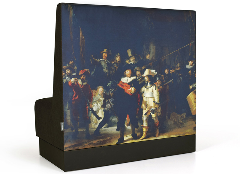 Zachte bank met hoge rug. Deze bank kan geconfigureerd worden naar smaak en budget. Hoge of middelhoge rug, unikleur of bedrukt met beeld naar keuze. Leverbaar in 5 stofgroepen. Neem contact met ons op voor de verdere uitwerking.