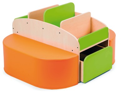 Laag boekenrekje, heel toegankelijk voor jonge kinderen om een boekje uit te kiezen. Opgedeeld in 4 vakken, met ruimte onderin om 2 kisten op wielen te plaatsen. Ongemonteerd geleverd.