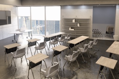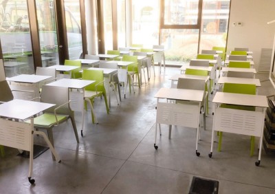 Het blad van deze individuele tafel kan heel snel en eenvoudig opgeklapt worden waardoor de tafels compact aan de kant geplaatst kunnen worden.