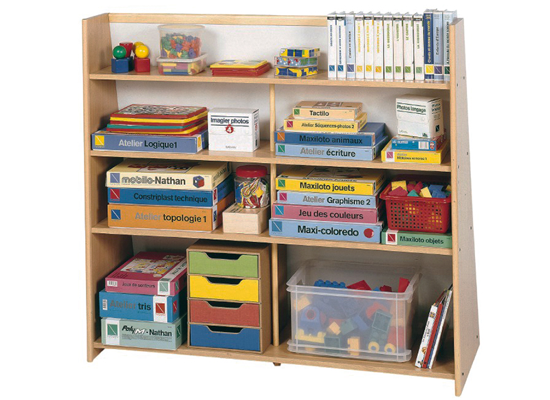 Functionele boekenkasten, die tevens kunnen worden gebruikt als scheidingswand tussen twee speelhoeken. Aan de ene zijde een schuin vlak om op meerdere niveaus boeken en platen uit te stallen, aan de andere zijde planken om dozen en spullen op te bergen.