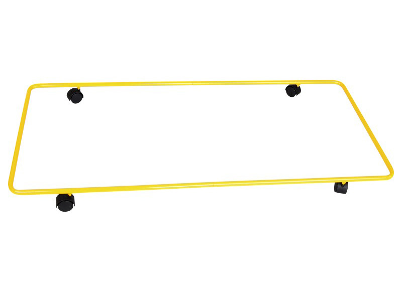 Dit metalen frame op wielen kan tot 15 plastiek rustbedjes dragen.