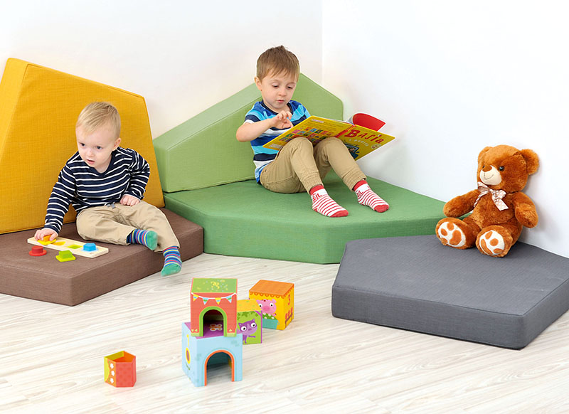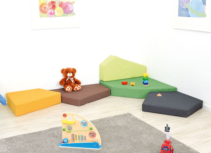 5 hoekige blokken in verschillende vormen, kleuren en grootten.