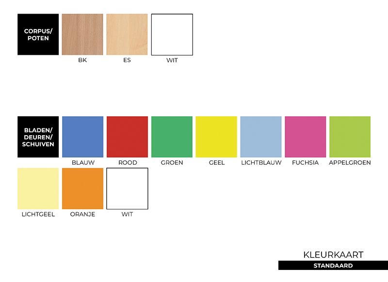 - Kies de kleur van de deuren, kisten of laden: de deuren of kisten zijn leverbaar in 15 levendige kleuren
