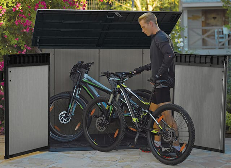 De Grande-Store biedt een moderne berging met een indrukwekkende 2020 L capaciteit. Hij kan gemakkelijk twee gewone en twee kinderfietsen, tuinmeubilair en tuingereedschap, of twee 360 L vuilnisbakken opslaan. Aan de voorzijde maakt de hellende drempel het eenvoudig om zware voorwerpen naar binnen en buiten te rollen. Aan de bovenkant is de deksel voorzien van hydraulische veren en een kit waarmee de vuilnisbakken automatisch mee open gaan wanneer de deksel van de Store wordt geopend. Deze berging is zowel aantrekkelijk als duurzaam dankzij de innovatieve DUOTECH™ wanden.