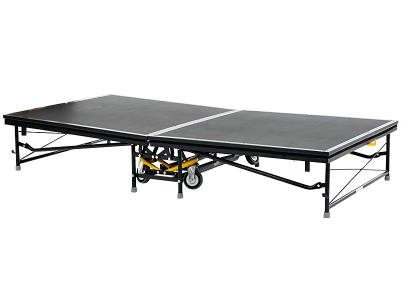 Omschrijving Sico podia zijn door hun design en techniek speciaal ontwikkeld om snel en eenvoudig opgesteld te kunnen worden. Meerdere podiumelementen kunnen bij elkaar geplaatst worden zonder gebruik te moeten maken van losse verbindingselementen. Gereedschap is eveneens niet nodig. Een podium kan door 1 persoon verplaatst worden in gesloten toestand. Deze rubberen wielen zijn veilig voor vloeren en laten geen sporen na. Alle metalen onderdelen worden voorzien van een duurzame hoogwaardige ingebakken epoxylaag. Een podiumoppervlak bestaat uit 15 mm Fins berkenmultiplex en is bekleed met 1,5 mm zwart antislip vinyl. In open toestand rusten de podia op stalen steunen die een zware belasting tot max. 750 kg/m2 kunnen dragen.