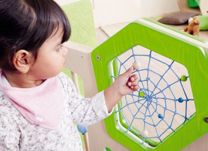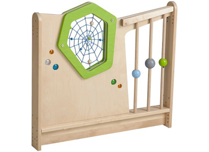 Met kleurrijke prisma‘s en verschuifbare gekleurde ballen in het spinnenweb en aan de stangen.