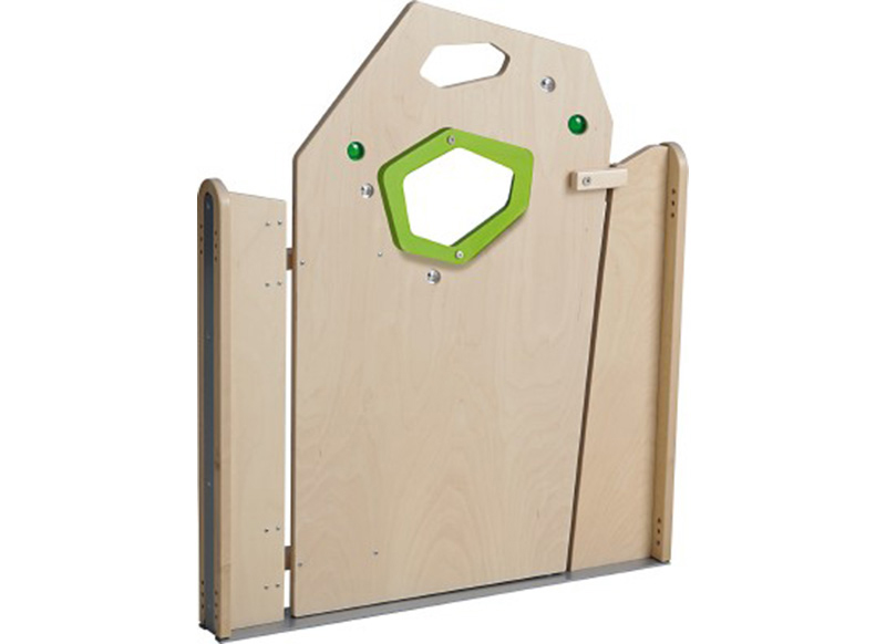 De deur heeft een acrylvenster en kleurrijke prisma‘s. Kinderen kunnen de deur niet openen, hij moet door een volwassene opgetild worden. Enkel vaste montage (zonder ogen) tussen scheidingwanden mogelijk.