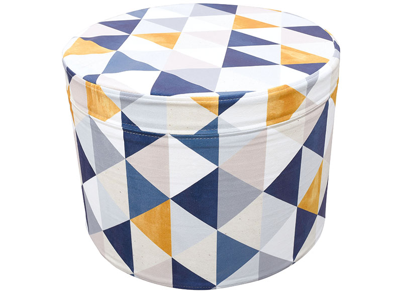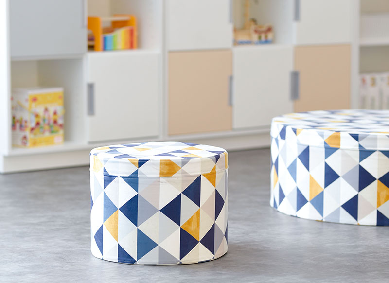 Omschrijving Kleine poef met driehoekjes motief. De poefjes zijn rond en zeer comfortabel, bekleed met zachte nordic kleuren. Mogelijk om ze decoratief te gebruiken in de buitenschoolse opvang of als stoeltje aan een tafel voor kinderen.