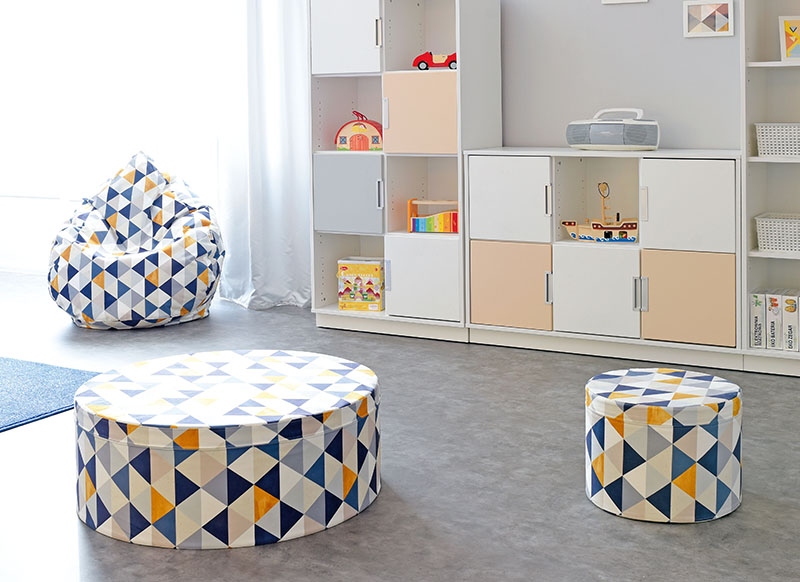 Zachte kleine poef met driehoekjes motief. Lekker comfortabel voor in de buitenschoolse opvang.