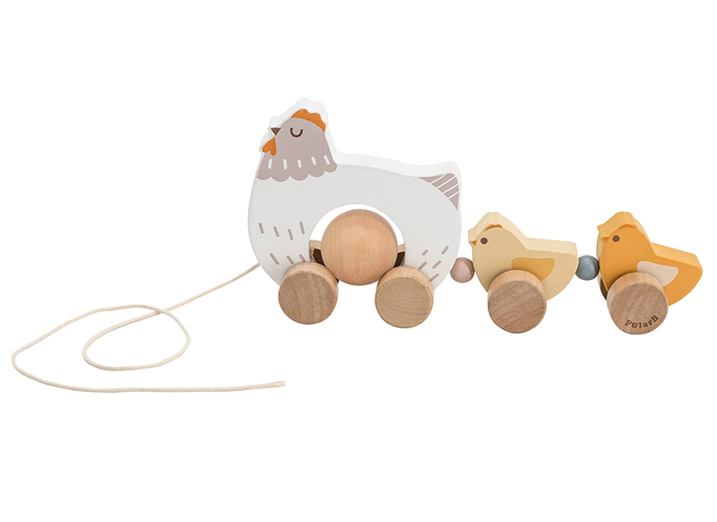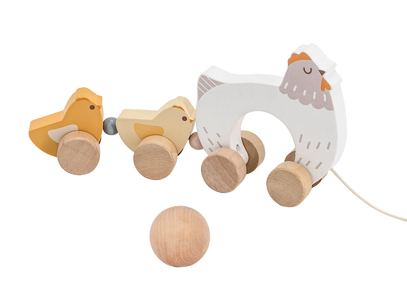 Dit stevige en duurzame trekspeelgoed is ideaal voor peuters die net leren stappen of graag in beweging zijn. Door de trekbeweging wordt hun evenwicht en hand-oogcoördinatie getraind. Ook stimuleert het rollenspel waarbij de kip en kuikens tot leven komen de sociale en cognitieve ontwikkeling.
