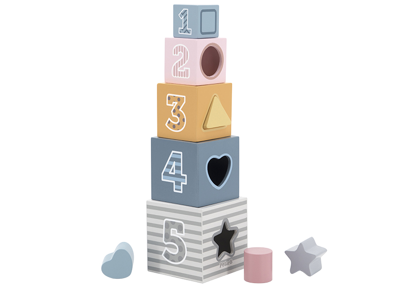 Omschrijving Mooie stapelblokken in rustige kleurtjes. Elke blok is voorzien van een cijfer, ideaal voor de eerste cijferherkenning! 4 blokken zijn elk voorzien van een unieke opening waar één van de bijgeleverde figuren in past. Kleur en vorm sorteren met deze toren wordt kinderspel. Geschikt voor kinderen vanaf 12 maanden.