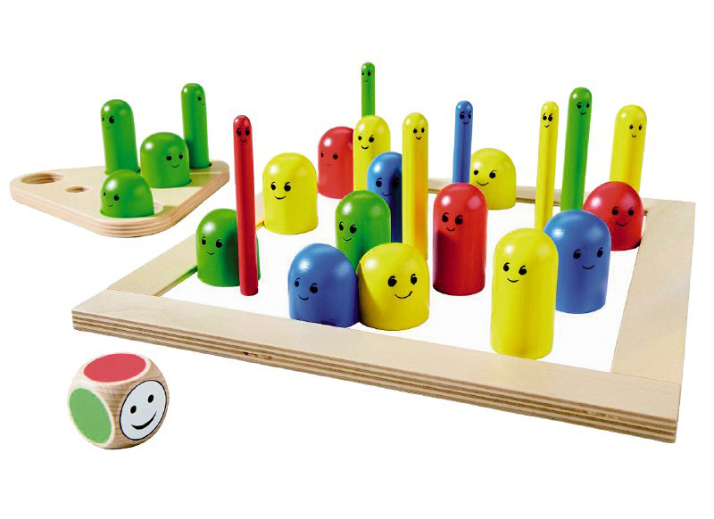 Samenstelling 4 houten borden met gaten voor elk 8 wormen in 4 kleuren, 4 wormvangers, 1 magnetisch bord en 1 dobbelsteen.