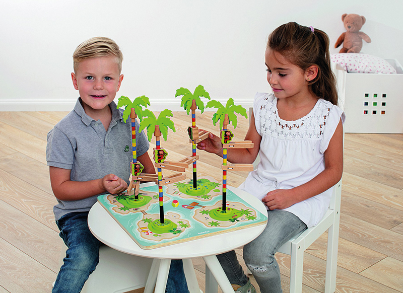 Omschrijving De apen hebben zin in een race! Ze staan allemaal klaar op hun plaats om zo snel mogelijk de top van hun palmboom te bereiken. Help je aapje de top als eerste te bereiken, maar denk na over elke zet die je doet. Want het is glad op weg naar de top! Een tactisch spel dat ook nog eens helpt met de ontwikkeling van de fijne motoriek op een spelende manier.