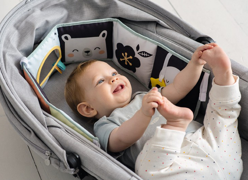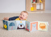 Een zacht friemelboekje met twee zijden om in het park of op de speelmat in het kinderdagverblijf mee te spelen.