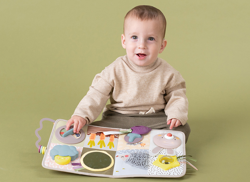 Omschrijving Het activiteitencentrum bevat 13 ontwikkelingsactiviteiten: muziek, lichtgevend konijntje, kiekeboe-activiteiten, een ster met kleurrijke lintjes, een tactiele egel, een bijtbietje, rammelende balletjes, een ratelrupsje, een spiegeltje, een doolhof met kleurrijke ringetjes. Deze verschillende activiteiten stimuleren de ontwikkeling van de zintuigen, fijne en grove motoriek en oog-handcoördinatie van de baby. Het activiteitencentrum kan aan de zijkant van het park bevestigd worden, of het kan vanop de buik bespeeld worden of gewoon als een boekje op de schoot.