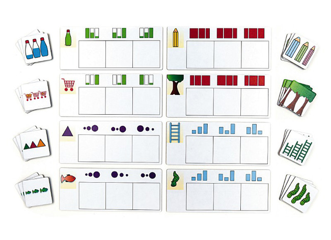 Een uitdagend spel om voorwerpen te sorteren en in serie te plaatsen. De concepten: kort-lang, wijd-nauw, vol-leeg, klein-groot worden voorgesteld op 2 manieren.