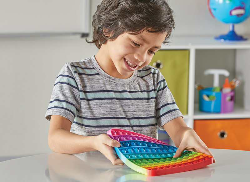 Dit popperbord doet dienst als rekenhulpmiddel en als angst- en friemelspeeltje. Honderden borden zijn effectieve manipulatiemiddelen voor leerlingen om de basis tien-instructie van ons getallensysteem te visualiseren, en de gedrukte getallen op elke pop voegen een tastbaar aspect toe aan het leren van wiskunde.
