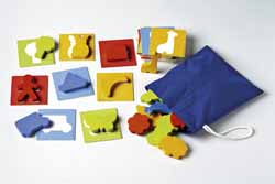 Dit spel wordt gespeeld als een lotto: om de beurt zoeken de kinderen in de zak het juiste voelobject. Elk object hoort op een bijhorende vormplaat.