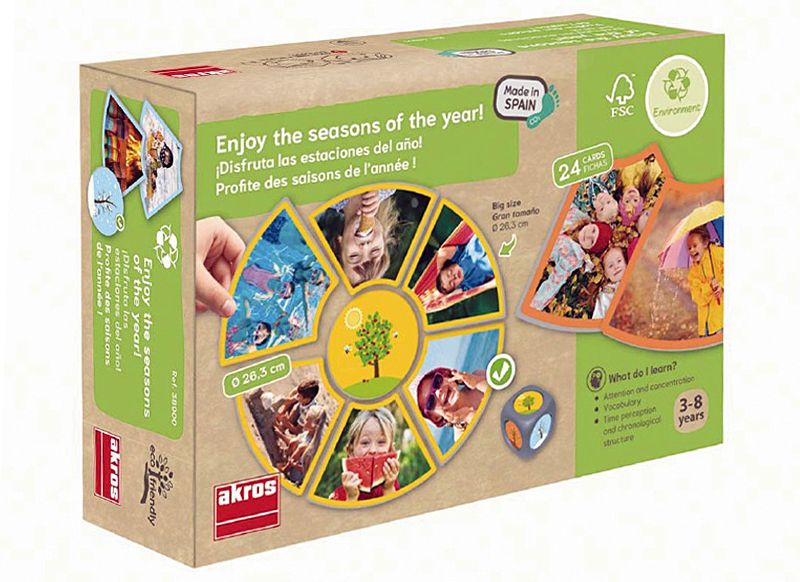 Omschrijving Hoe werkt het spel? Elk seizoen heeft een ander gekleurd kader waardoor je het gemakkelijk kunt associëren met de kaarten. Groen is de lente, geel is de zomer, oranje is de herfst en blauw is de winter. Laat het kind de dobbelstenen gooien en het spel is begonnen! Valt de dobbelsteen op blauw? Dan probeert het kind een activiteit te associëren met de winter. Ontdek samen de verschillende activiteiten die bij de verschillende seizoenen horen. De levensechte beelden nodigen het kind uit om de seizoenen van het jaar keer op keer te verkennen.