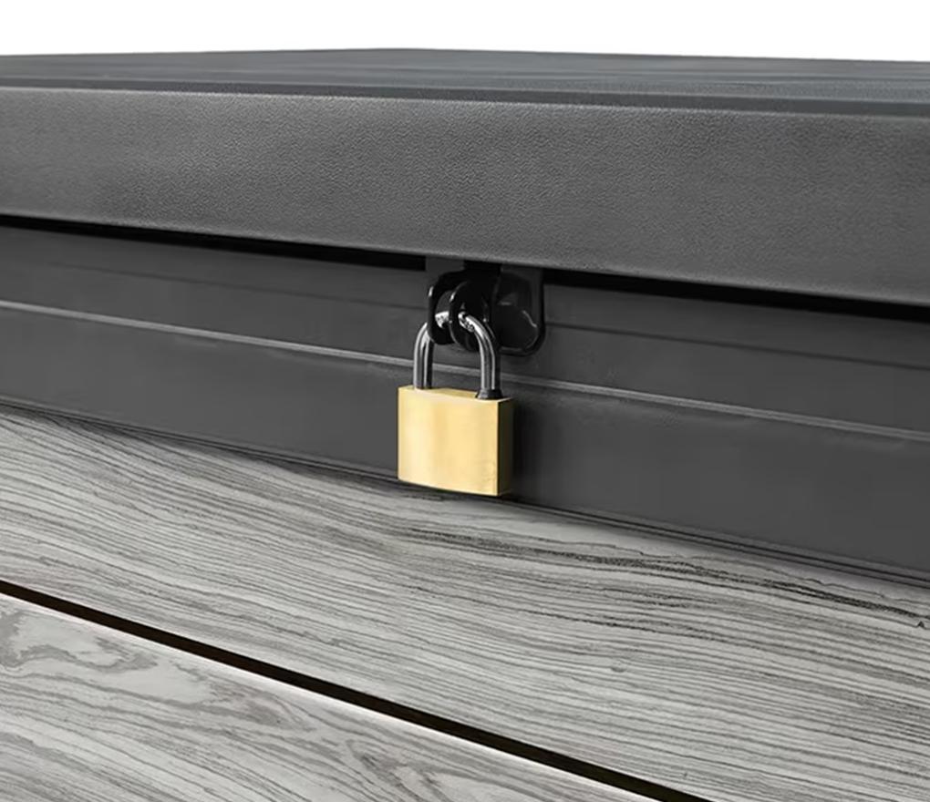 Kenmerken Gemaakt van duurzaam kunststof (>80% gerecycleerd materiaal). Spatwater en UV bestendig. Eenvoudig te reinigen. Houdt de inhoud droog en geventileerd. Afsluitbaar (slot niet inbegrepen). Eenvoudig in elkaar te zetten. Inhoud: 870 liter.