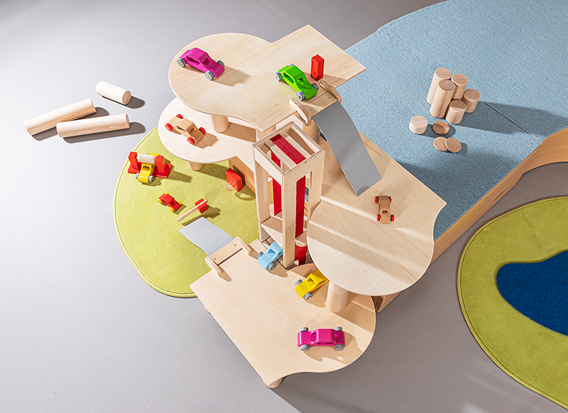 Laten we naar het bouwproject van de parkeergarage gaan! Met de veelzijdige bouwplaten, kolommen en hellingen kunnen kinderen volgens hun ideeën een parkeergarage voor hun wagenpark bouwen en deze steeds opnieuw vormgeven.