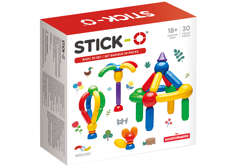 Omschrijving Stick-O is Basic set is geschikt voor kinderen vanaf 18 maanden en leert de peuters spelen met magneten en wat de mogelijkheden hiervan zijn. Tientallen bouwcombinaties zijn mogelijk en in het modellenboekje staan er 36 voorbeelden, waaronder een voetballer, een piano of gekke gezichtjes. De doos telt 30 stuks met 9 verschillende vormen. Stick-O is combineerbaar met soortgelijk magnetische bouwspeelgoed.