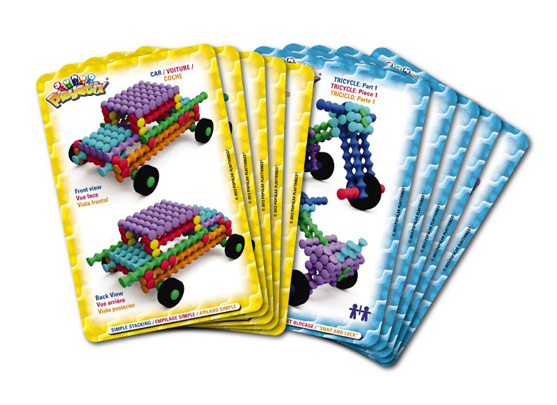 Samenstelling 80 sticks in 7 kleuren en lengten, 4 wielen en 10 voorbeeldkaarten in een enige opbergkoffer.80