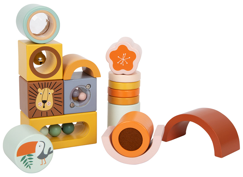 Deze 12 zintuiglijke bouwstenen van hout zijn echt iets bijzonders! Hun opwindende visuele en akoestische eigenschappen trainen alle zintuigen en nodigen uit tot spelen en verwonderen.