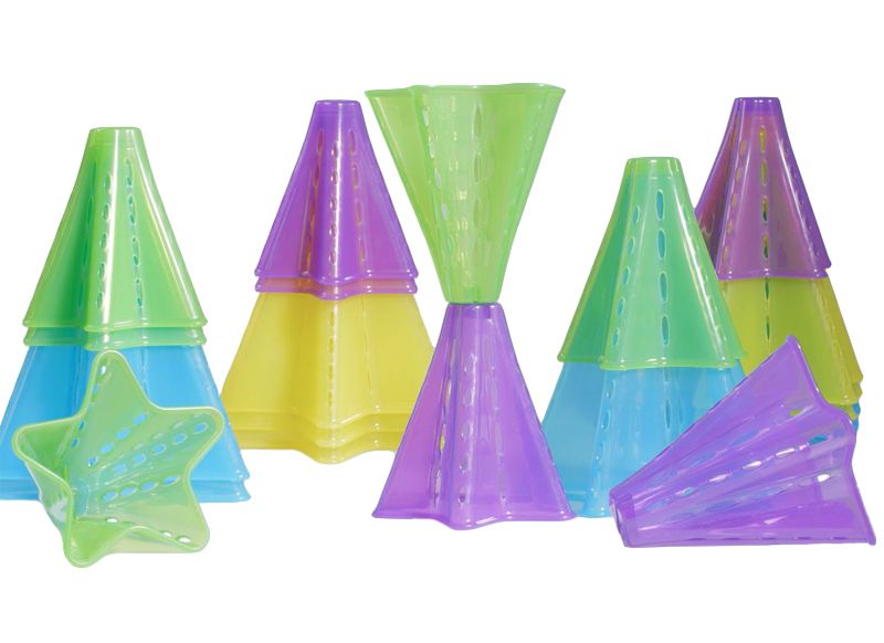 Omschrijving Introduceer deze veelzijdige, levendige, kleurrijke kegels in verschillende leeromgevingen waar kinderen kunnen stapelen, posten, rollen en ontdekken. Transparante kegels die een boeiend scala aan mogelijkheden bieden. Ideaal bij open-ended play. Hoe kan je hier bijvoorbeeld mee spelen? 1) stapel de stapelbekers in elkaar of op elkaar, 2) plaats ze in de waterbak of neem ze mee in bad en ontdek hoe het water door de gaatjes sijpelt, 3) probeer een veter of ander dun materiaal door de gaatjes van de kegels te rijgen.