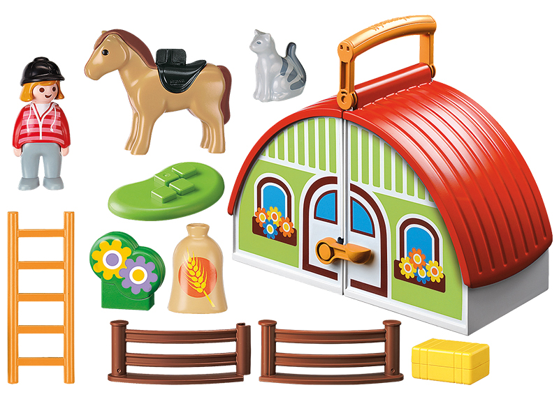 Samenstelling Manege speelkofferte met ruiter, paard, hekken, ladder, bloemen, poes, stro en zak graan.