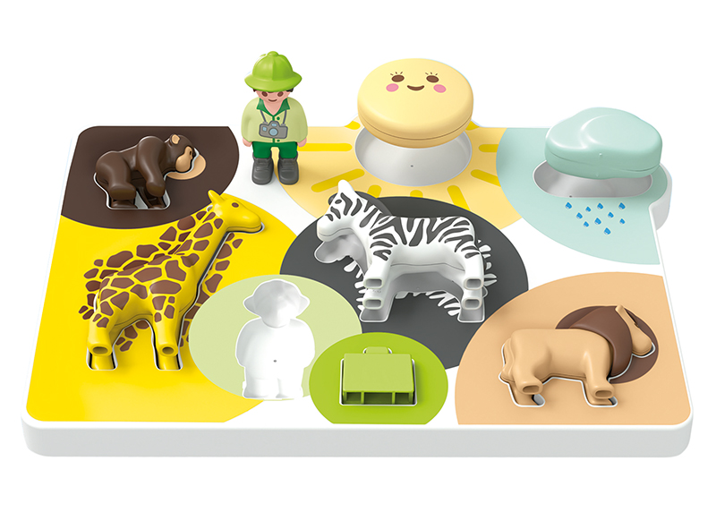 Op het inlegbord vind je leuke, herkenbare figuurtjes zoals een aap, een zebra, een giraf, een leeuw, een mannetje in safari-uniform, een koffer én natuurlijk de zon en een regenwolk. Perfect om vormen te herkennen en te leren sorteren! Elk figuurtje past netjes in het bijhorende silhouet – ideaal om de fijne motoriek te versterken.