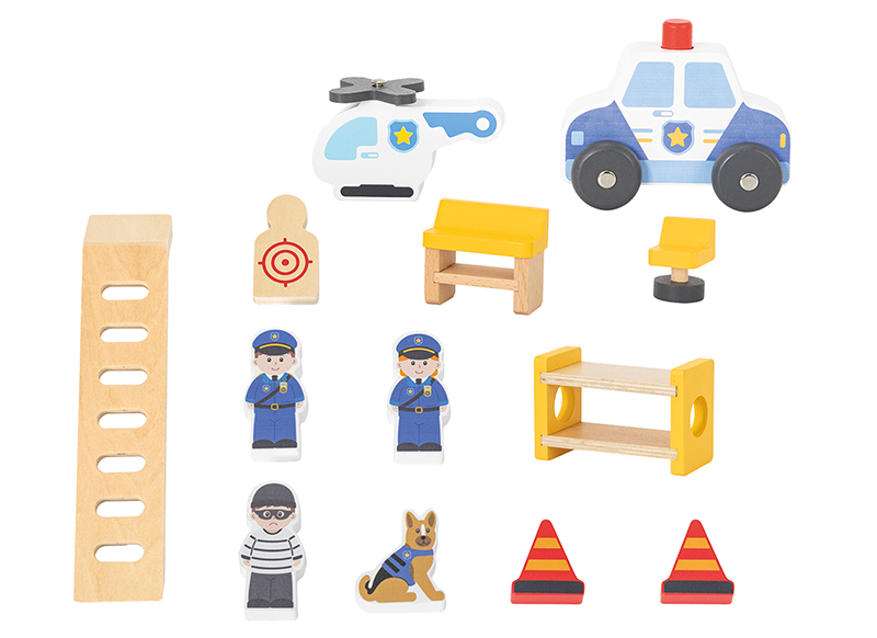 Omschrijving Dé speelset voor jonge waaghalzen en mini-speurders. Deze kleurrijke houten speelset zit boordevol details: een stoer politiebureau, een politiewagen, een helikopter, twee agenten, een dief én een trouwe politiehond. Alles wat je nodig hebt voor urenlang spannend rollenspel!