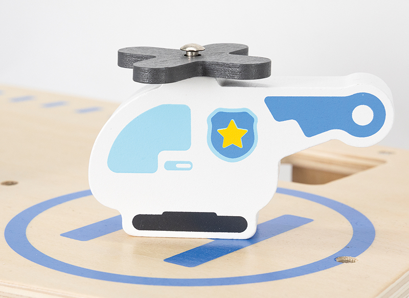 Politiekantoor in hout met helikopter, wagen en figuren. Stimuleert rollenspel, samenwerking en probleemoplossend denken.