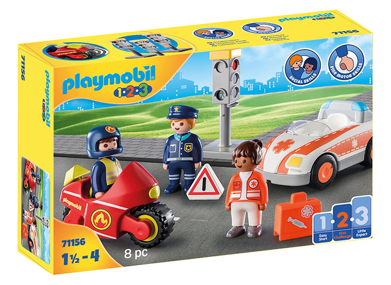 Samenstelling De speelset bevat 3 Playmobil 1.2.3. figuren met een brandweermotorfiets met "rijgeluiden", verstelbare verkeerslichten, verkeersdriehoek, dokterstas en een hulpverleningsvoertuig.