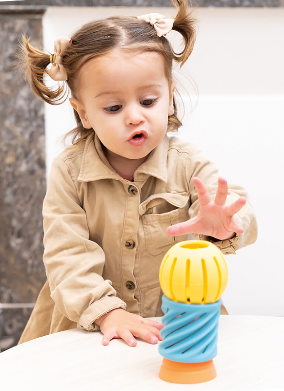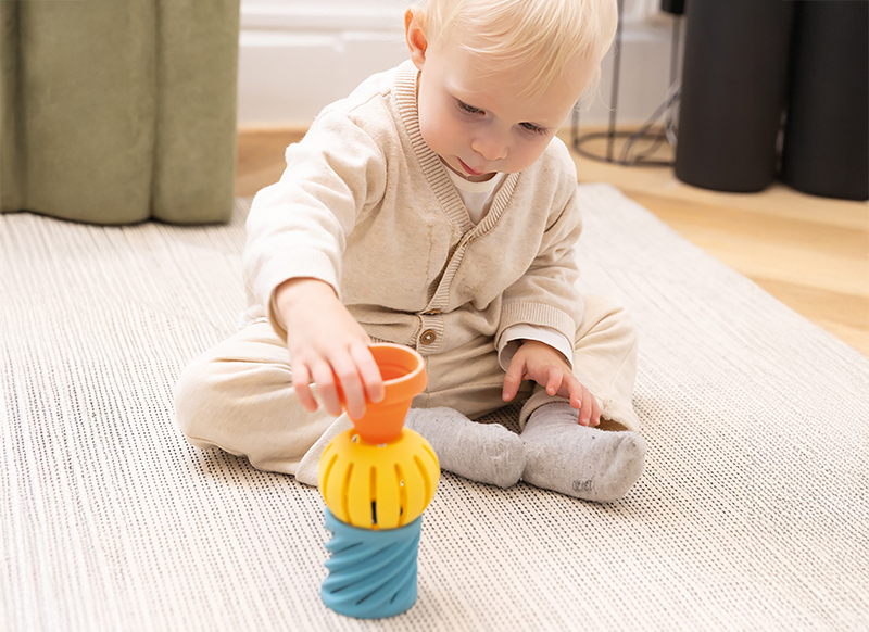 Door de unieke vorm en stapelbare elementen nodigt dit speeltje uit tot grijpen, bouwen en experimenteren. Zo stimuleert het op een natuurlijke manier de fijne motoriek, hand-oogcoördinatie en de ontwikkeling van de grijpreflex. Baby’s leren spelenderwijs oorzaak en gevolg begrijpen wanneer ze de onderdelen op elkaar stapelen en weer omgooien.