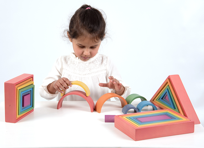Speelblokken - tickit Rainbow Architect - hout - geometrisch - regenboogkleuren - loose parts - set van 28 assorti