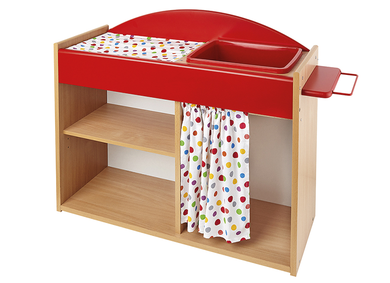 Meubel waarop de poppen kunnen worden gewassen en verschoond. Met legplanken en klerenhangers waarop de poppenspulletjes en kleertjes netjes kunnen worden opgeborgen.