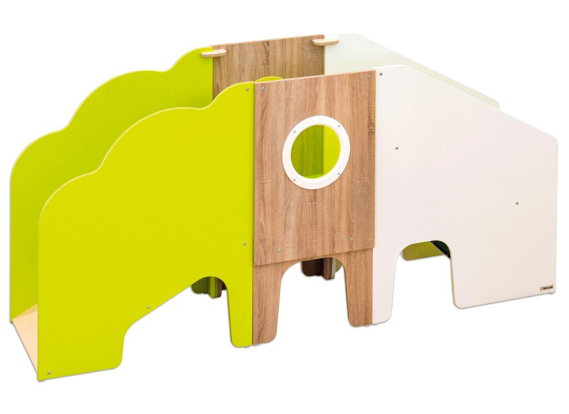 Een trap en glijbaan in 1 opstelling met 2 leuke patrijsraampjes voorzien van plexiglas. Kinderen kruipen onder het toestel en kunnen komen piepen langs de transparante stukken van de trap.