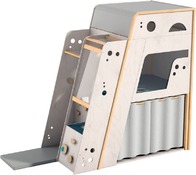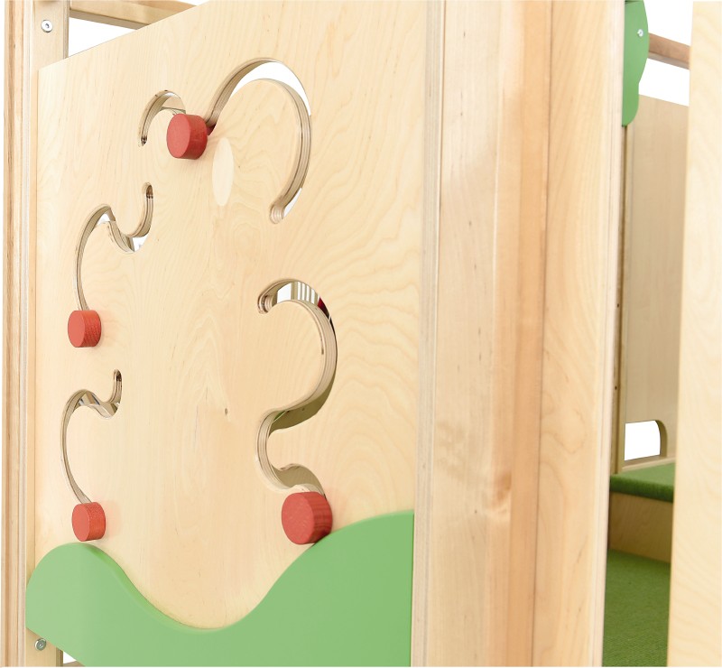 Speel hoek met veel attracties: glijbaan, kruiptunnel, spiegel, wandspeeltjes, patrijspoort met ballen.