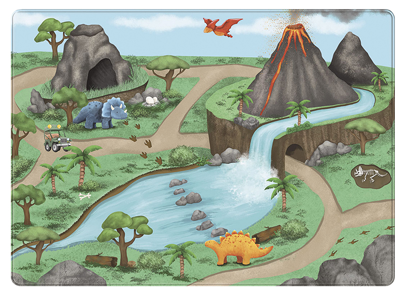 Omschrijving Brul als een T-rex, sluip als een Velociraptor of relax tussen de varens! Dit Dino Speeltapijt dompelt kinderen onder in de wereld van dino’s, vulkanen en oerwouden. Met levendige details en frisse kleuren wordt het een uitnodigende speelplek voor elke kleine dinoliefhebber.