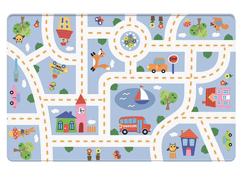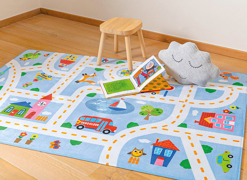 Spelenderwijs de wereld verkennen? Dit blauwe stratentapijt barst van kleur, details en speelmogelijkheden!