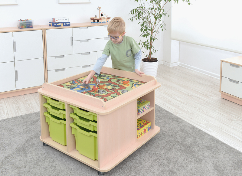 Speeltafel met verhoogde rand zodat het speelgoed niet van de tafel valt. Voldoende opbergruimte onderin.