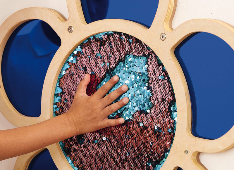 Tactiele wand met pailletten die van kleur veranderen naargelang de richting waarin je erover wrijft. Eindeloos glitterplezier dat ideaal is voor het bevorderen van de fijne motoriek.