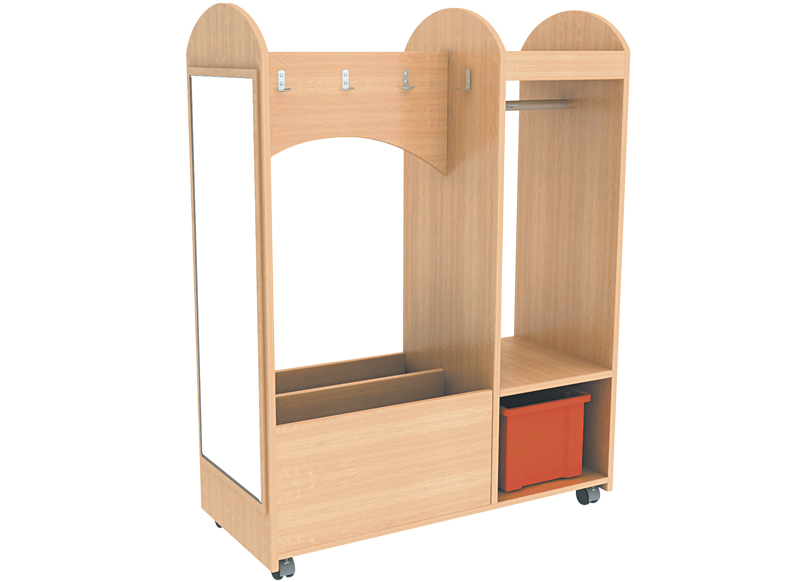 Groot verkleedmeubel met kapstokken en ruimte voor kleerhangers. Opbergvakken onderaan. Voorzien van een passpiegel van onbreekbaar plexiglas.
