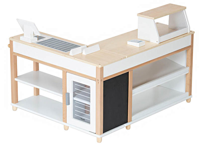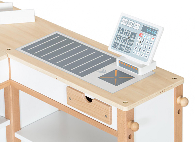 Deze prachtige winkeltoog met kassa mag niet ontbreken in de fantasiehoek van de kleuterklas.