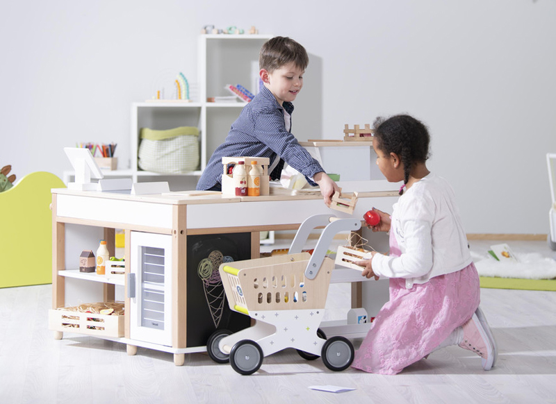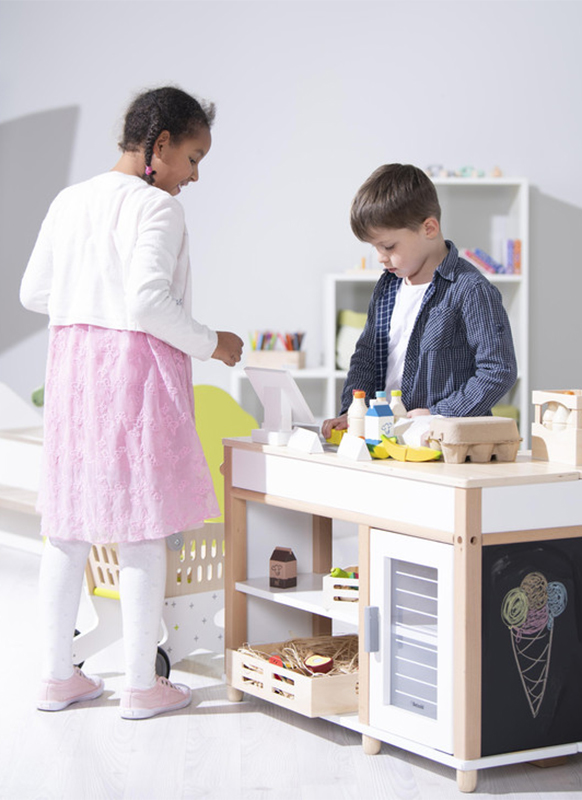 Omschrijving Boodschappen doen, verkoopgesprekken voeren en goederen aanbieden - de kleuterwinkel biedt jonge winkeliers vanaf 2 jaar veel speelmogelijkheden.